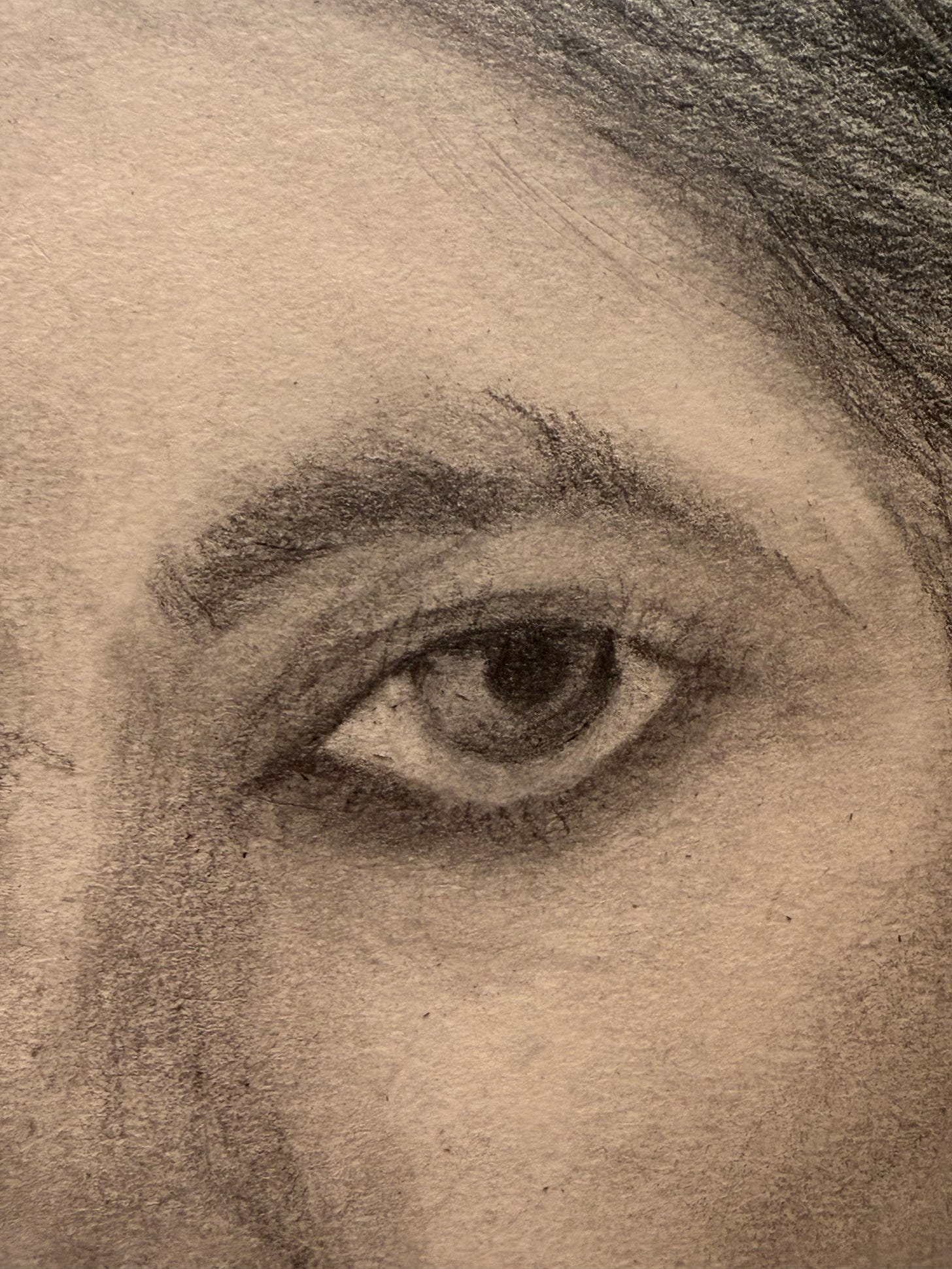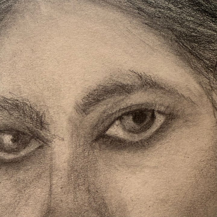 Like I mentioned before, I’ve never taken a drawing class or learned the “right” way to draw. I’ve always just kept drawing and erasing until it “felt right". I guess that feeling is what has always led my art practice. Another influence that I’ll note is my mother. When I was younger, I found a series of portraits she drew in the attic of her childhood home. They were beautiful and she captured the essence of people so well. She was and is a naturally gifted artist, whether she recognizes it or not, and even went to art school for a short while but ended up dropping out to pursue a teaching career instead. Growing up, I remember her drawing large animals on her chalkboard in her classroom for her kindergarten students that were so life-like and detailed. I think watching her draw on the board must have influenced me in some way and I do remember one piece of advice she gave that stuck with me when she said, “it’s all in the eyes”. Now that I’m trying to draw myself, I’ve spent the most time on my eyes, trying to get them right, knowing when they are, I will feel it.